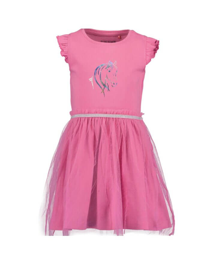Deze prachtige jurk van Blue Seven is een droom voor echte paardenmeisjes! Met zijn speelse ruches aan de korte mouwen en een subtiele glitter tailleband, straalt deze jurk zowel elegantie als speelsheid uit.De comfortabele pasvorm en zachte stof maken het perfect voor elke dag, terwijl het stijlvolle design ideaal is voor speciale momenten. Combineer met sneakers voor een casual look of met ballerina’s voor een extra schattige uitstraling!