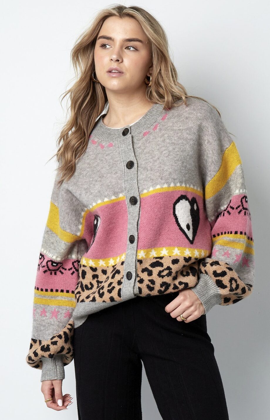Deze gebreide wolmix cardigan combineert comfort met uitgesproken stijl dankzij de oversized pasvorm en het unieke patroon. De mix van luipaardprint, hartmotieven en geometrische strepen maakt dit item tot een opvallend statement binnen elke collectie. Gemaakt van hoogwaardige garens voor een duurzame kwaliteit en rijke textuur. Als onderdeel van het Chloe-merk staat deze cardigan voor innovatief design en premium afwerking.