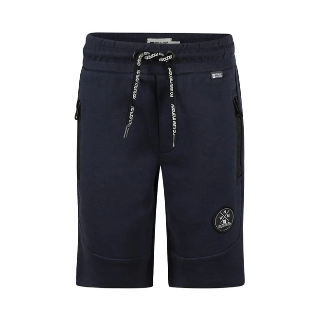 No Way Monday jogging shorts in donkerblauw. De korte jongens broek heeft stoere zwarte ritsjes en een zwart sierkoord. Hij is gemaakt van een zachte katoen met stretch.