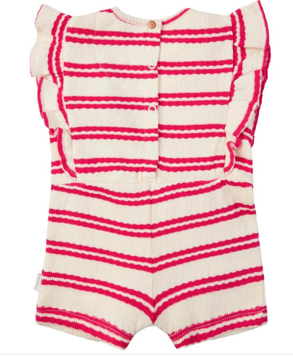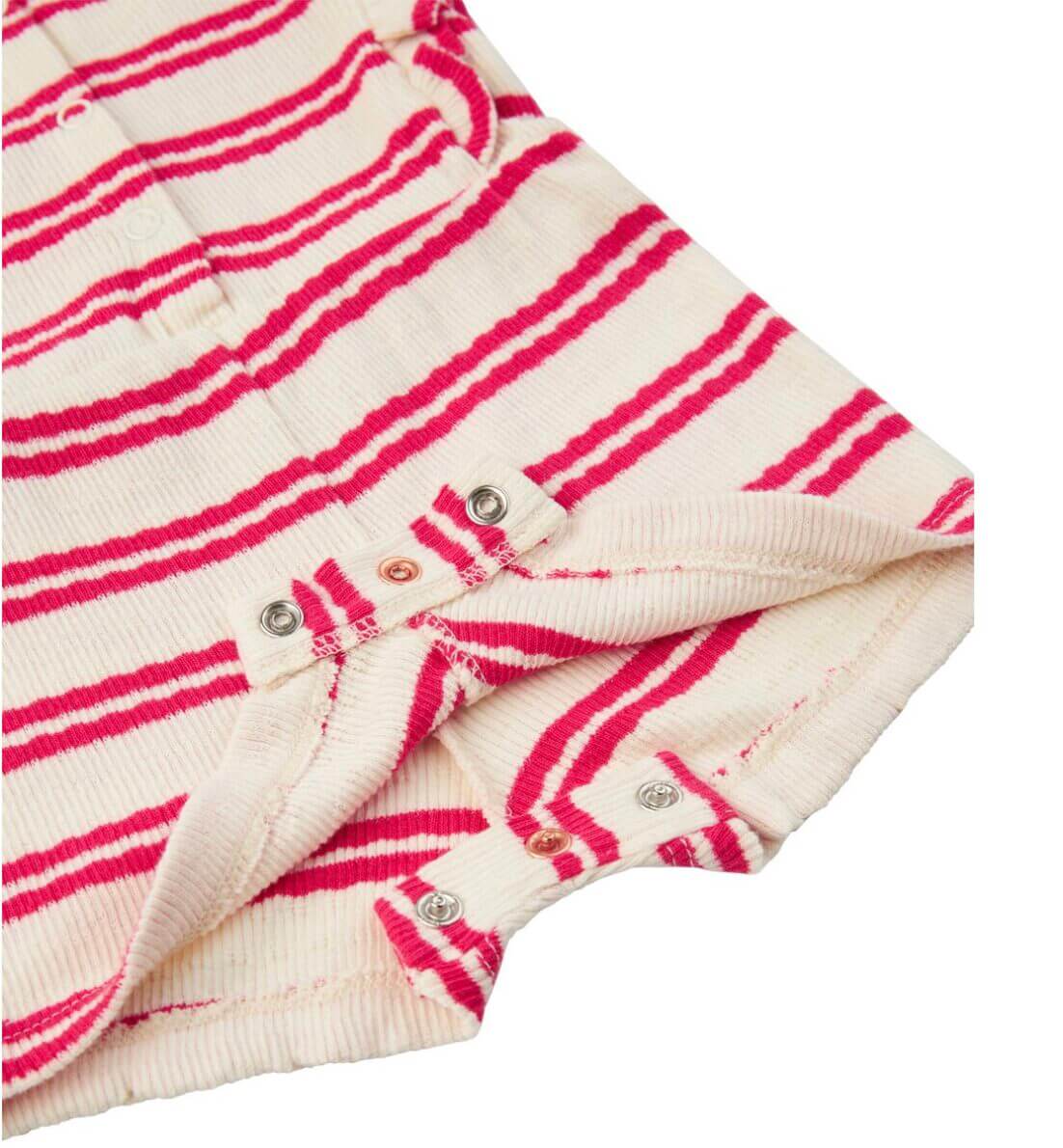 Het perfecte item voor de lente- en zomermaanden! In onze Mogul playsuit gaat jouw kleine meid de zonnige dagen in stijl tegemoet. Het hippe streepjespatroon zorgt ervoor dat ze een vrolijke verschijning wordt tijdens elke gelegenheid. Of ze het nu tijdens het spelen draagt of tijdens een dagje uit, ze ziet er altijd betoverend uit. De playsuit is daarnaast bijzonder comfortabel voor je baby. De zachte stof en comfortabele pasvorm zorgen voor veel draagplezier. Het kledingstuk is voorzien van slimme details, zoals drukknoopjes bovenaan en in de pijpjes. Dankzij deze drukknoopjes is gedoe met aan- en uitkleden helemaal verleden tijd. Het item is geproduceerd volgens het Better Cotton Initiative, waardoor je met deze aankoop een positieve impact hebt op de planeet. Waar wacht je nog op? Maak de zomer- en lentecollectie van je dochter compleet met onze Mogual playsuit!